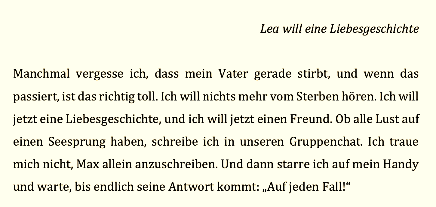 Nefeli liest im Podcast sonst meist Textauszüge anderer – für mich war es eine Premiere, sie mit einem eigenen Text zu hören. In Zentaur geht es um den sterbenden Georg, Vater von Lea und Ehemann von Ruth. Alle drei Perspektiven kommen zu Wort. Die Mutter denkt “mein Mann ist ein Oktopus”. Die Tochter “will eine Liebesgeschichte”, “will nichts mehr vom Sterben hören”. Der Vater denkt: “ein Kamel, es wird zum Löwen, es wird zum Kind. (…) Lasst mich los / aber / bleibt ein Weilchen”.